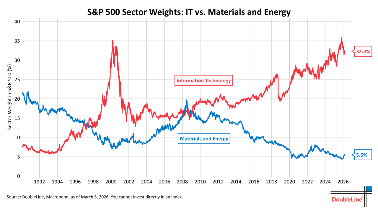 By comparison, Materials and Energy combined represent 5.5% of the index, near the lowest on record. However, the weighting appears to be picking up.
