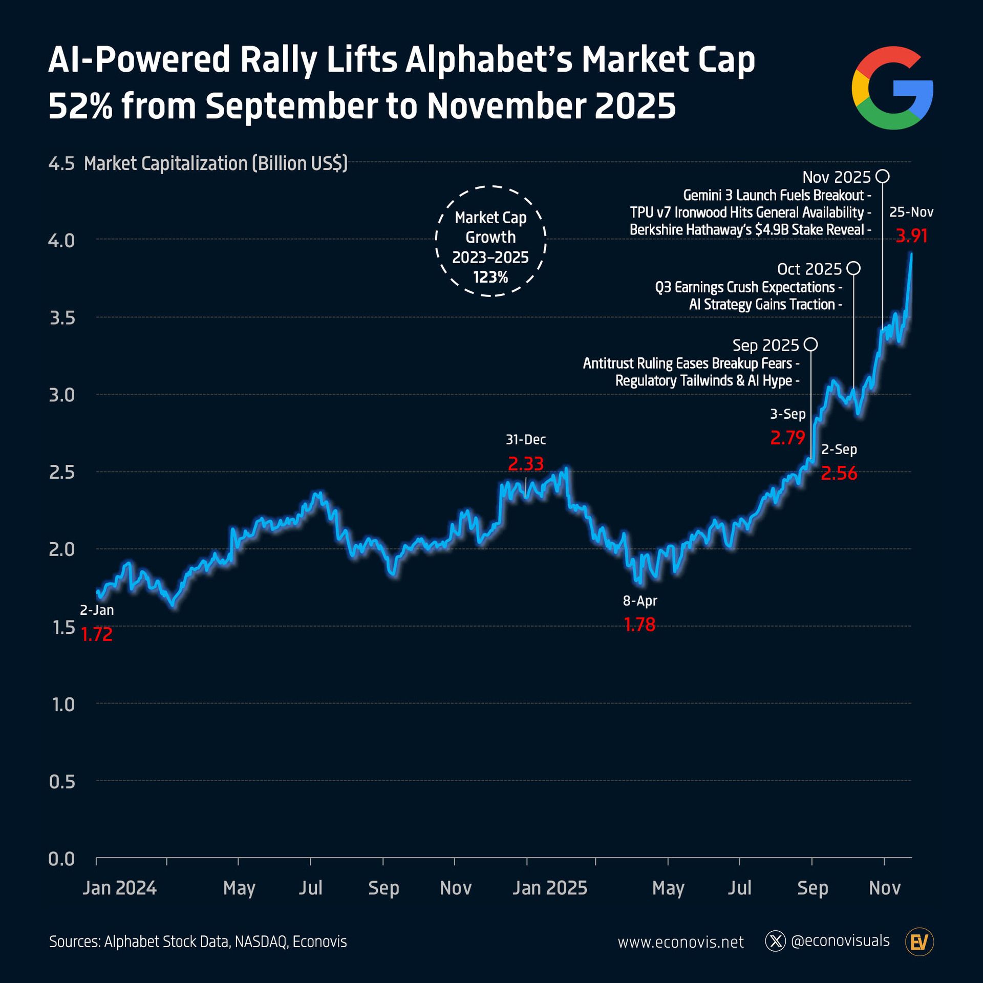 Google’s stock has rallied mainly because investors, including Berkshire Hathaway, see its AI plans delivering some promising results. The company is now training its own AI models on its own infrastructure using TPU chips. At the same time, the Gemini 3 model is delivering strong benchmark results.