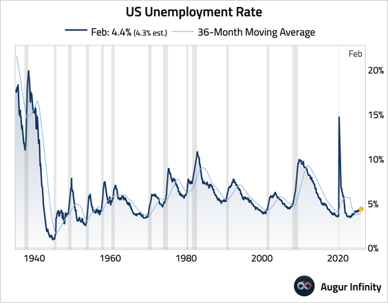 The unemployment rate rose to 4.4%, the 2nd-highest since October 2021, above expectations of 4.3%.