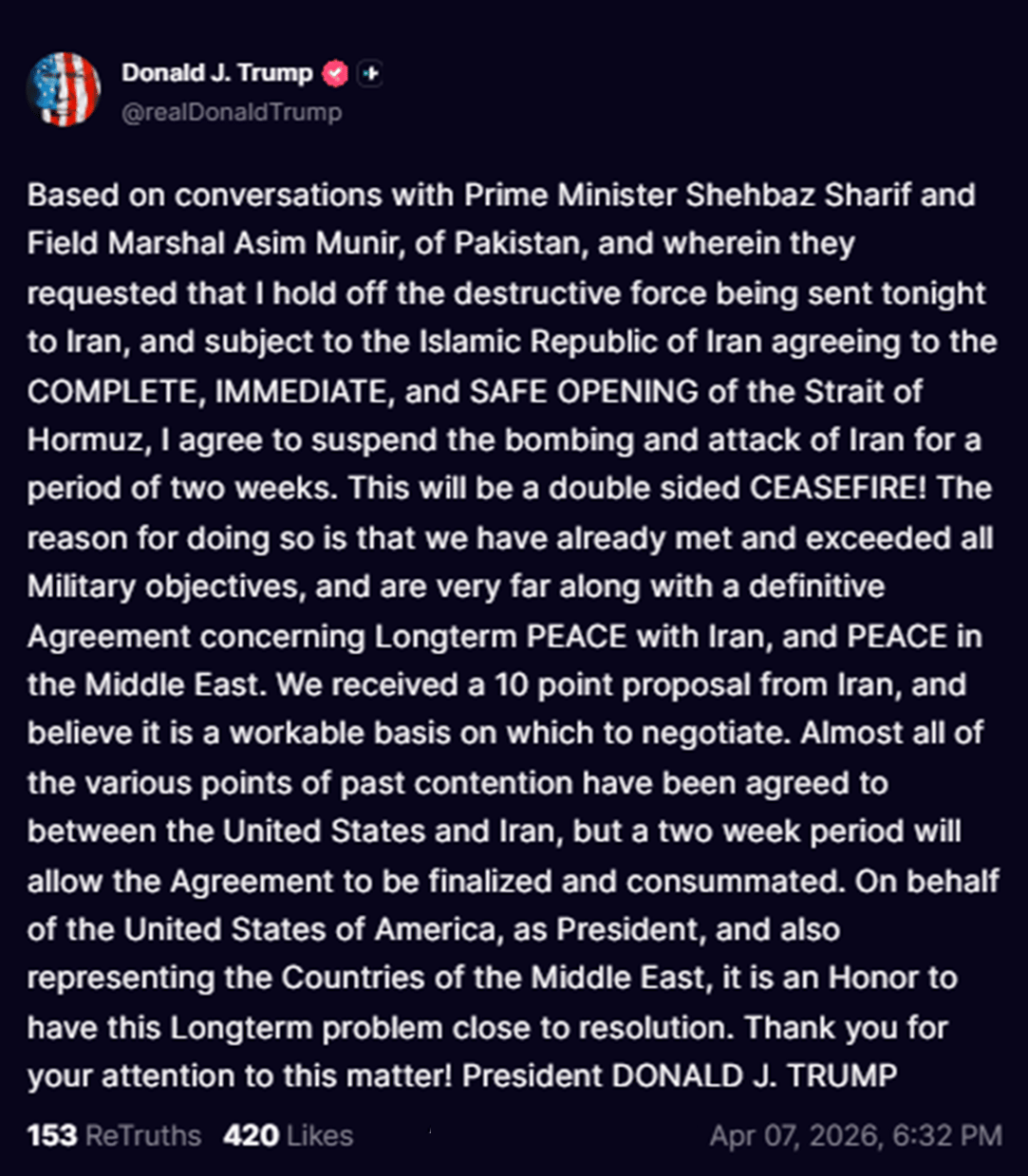 The US and Iran have agreed to a 2-week ceasefire, with Iran reopening the Strait of Hormuz for safe passage effective immediately.