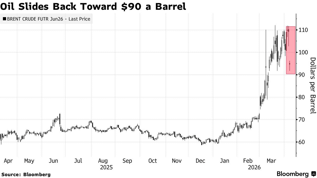 WTI crude plunged -15.1%, to $96, the LARGEST single-day drop since the 1991 Gulf War excluding COVID, while Brent fell -14.1%, to $94.