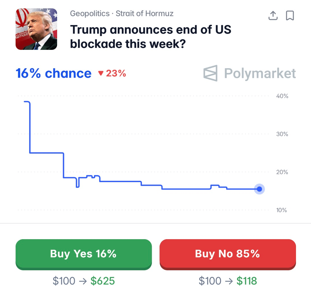 Meanwhile, prediction markets are not expecting Trump's blockade to end anytime soon. The odds of the blockade being lifted this week have dropped to just 16%.