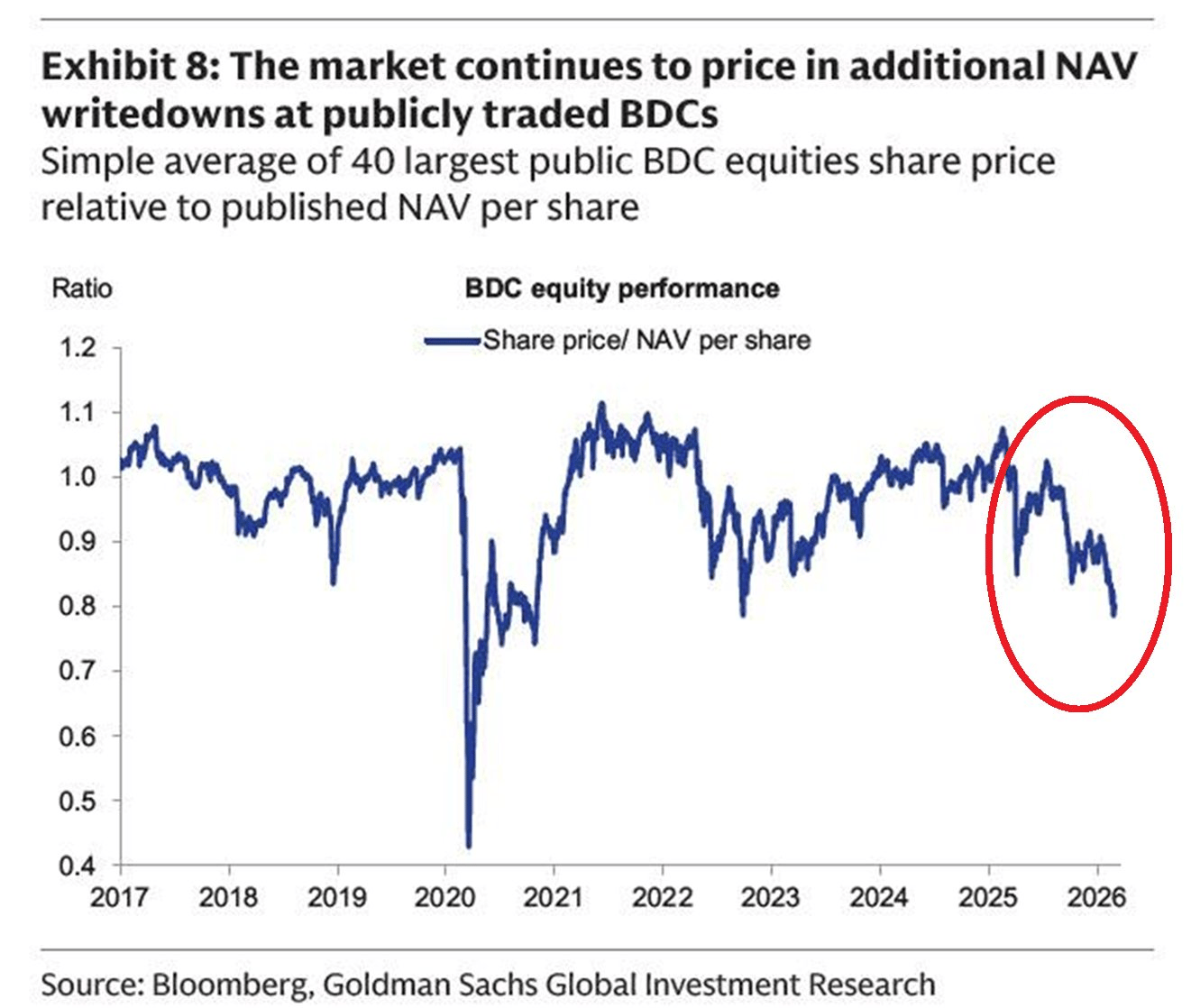 In total, The median listed BDC is trading at ~0.8x its net asset value (NAV), the lowest since 2020.