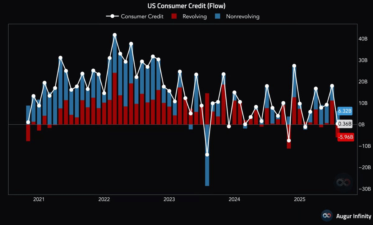 US consumer revolving credit, which covers credit cards, dropped by -$6 billion in August — one of the largest monthly drops since the 2020 Crisis.