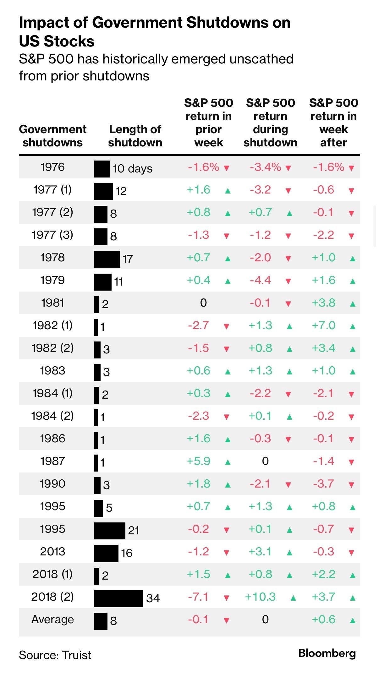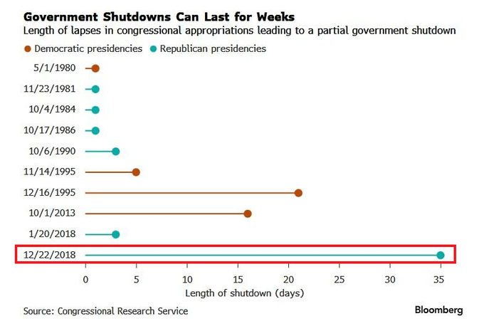 The average length of a shutdown is ~8 days. However, it is important to note that the 2018–2019 shutdown lasted 35 days, significantly longer than the average